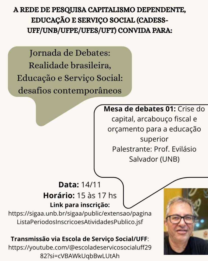 A Rede CADESS convida todos/as para o primeiro encontro da Jornada de Debates Realidade brasileira, Educação e Serviço Social: desafios contemporâneos com o tema “Crise do capital arcabouço fiscal e orçamento para a educação superior” com o prof. Evilásio Salvador (SER/UnB).
