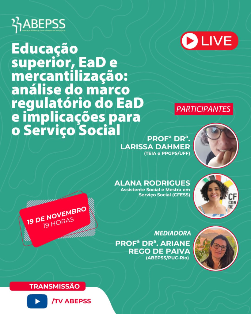 Na quarta-feira, 19 de novembro, a Abepss irá realizar a live “Educação superior, EaD e mercantilização: análise do marco regulatório do EaD e implicações para o Serviço Social”, com transmissão pela TV ABEPSS (YouTube). A atividade integra o projeto ABEPSS Ao Vivo e será realizada às 19h.