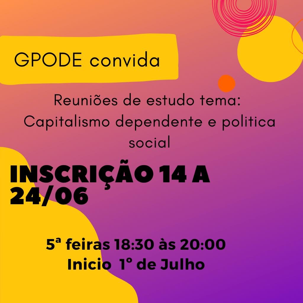 O GPODE (Grupo de Estudos e Pesquisas em Desenvolvimento Capitalista, Trabalho e Política Social), coordenado por Ana Paula Mauriel e Robson Roberto da Silva, convida para reuniões de estudo com o tema Capitalismo Dependente e Política Social.